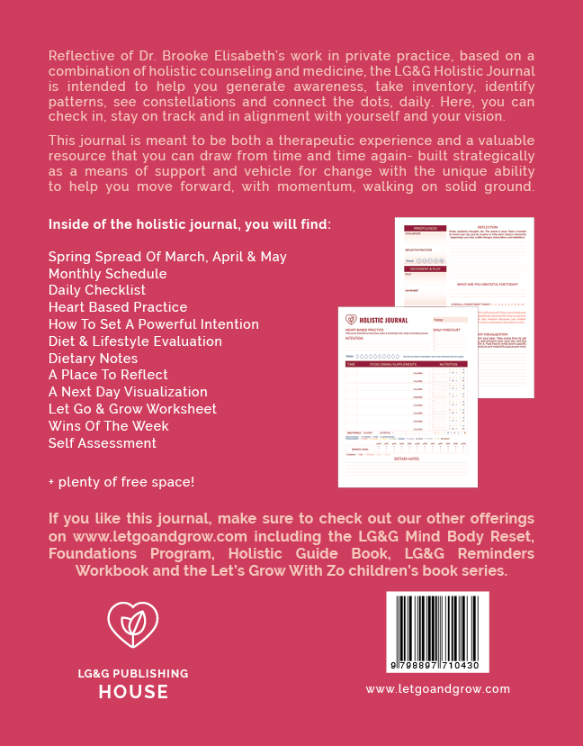 Reflective of Dr. Brooke Elisabeth’s work in private practice, based on a combination of holistic counseling and medicine, the LG&G Holistic Journal is intended to help you generate awareness, take inventory, identify patterns, see constellations and connect the dots, daily. Here, you can check-in, stay on track and in alignment with yourself and your vision.